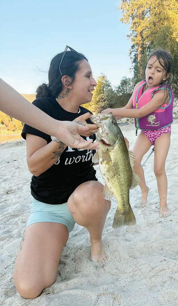 A local little girl made the catch of a lifetime at Bass Lake recently when she, if somewhat reluctantly, reeled in a bass nearly half her size.