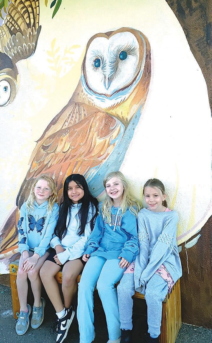 Shown are Della Rose Salonen, Juliana Martinez, Clara Scaffidi and Ava Brown on a “friendship bench” in front of a barn owl painting. Submitted photos