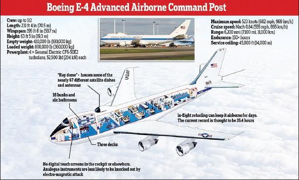 The plane is basically a flying command post that can hold up to 112 crew members and has a range of 6,200 nautical miles. The plane can also be refueled in flight to extends its time in the air.