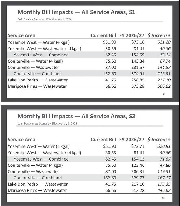 Mariposa County is considering two scenarios for a possible rate hike. S1 would include debt service on $1.2 million already loaned to the district’s to cover losses. S2 would involve Mariposa County forgiving the loan. Bartel Wells Associates graphics