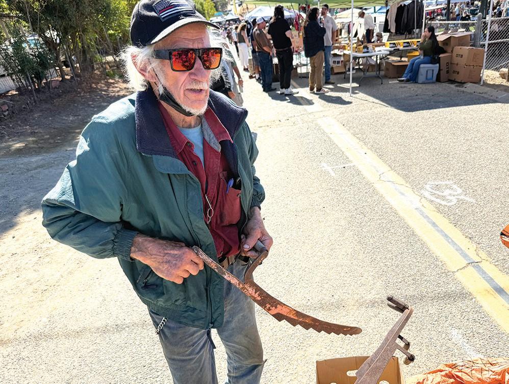 At the annual Hornitos Flea Market this past Sunday, Charles Gordon shows off a scythe that reminds him of the one he used to cut hay while growing up in Iowa. He got it for $12. See page A-4 for more details about the annual event.