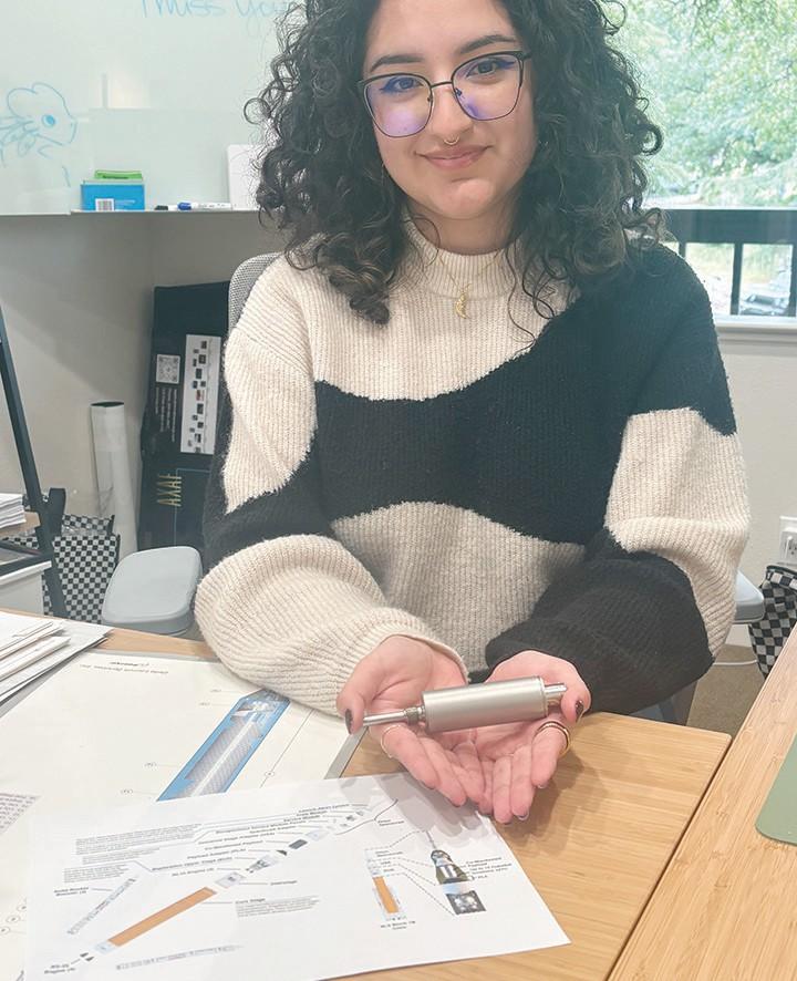 Maxine Chance, brand director at Tavis, holds a transducer at her office on Monday of this week. The diagram on the desk depicts where transducers from the company were on the Artemis II mission. Photo by Greg Little